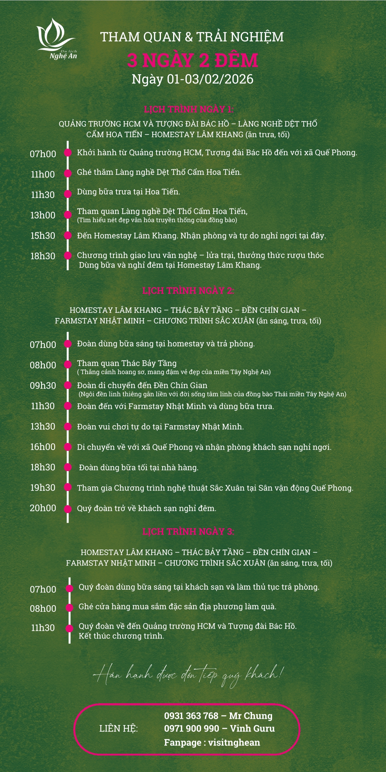 Và để có một chuyến đi trải nghiệm trọn vẹn Chương trình và khám phá mảnh đất Quế Phong, bạn có thể tham khảo 1 chương trình tour 3 ngày 2 đêm với nhiều hoạt động hấp dẫn: